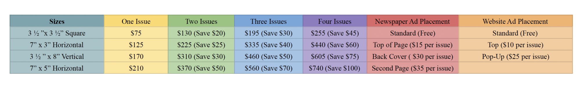 - Second Page: The most visible ad location available, next to our staff list and editors note. Extra fee of $35 per issue.
